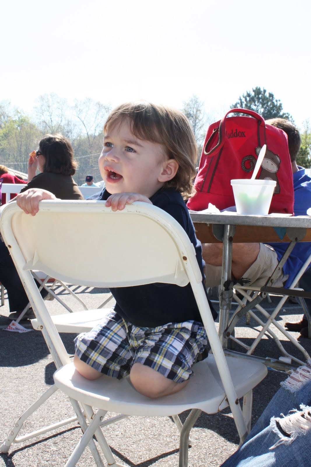We took Maddox out to the Heart of Dixie Railroad Museum in Calera this past weekend for A Day Out With Thomas. To say that he is a big fan of trains would be a huge understatement...he was in heaven! He loved just walking around looking at all of the trains. I don't even think he would have cared if Thomas hadn't been there, although that was a big bonus. They had lots of activities for the kids to do including a petting zoo, train tables set up that they could play with, coloring stations, and a musician that sang lots of kiddie songs. We also got a chance to ride on Thomas too! This was Maddox's first train ride. The ride was pretty short (only around 20-30 minutes or so) and the train just goes out in one direction and then goes backwards on the way back. Maddox thought it was pretty great though and he enjoyed looking out the window and waving to everyone and everything. What a fun day!